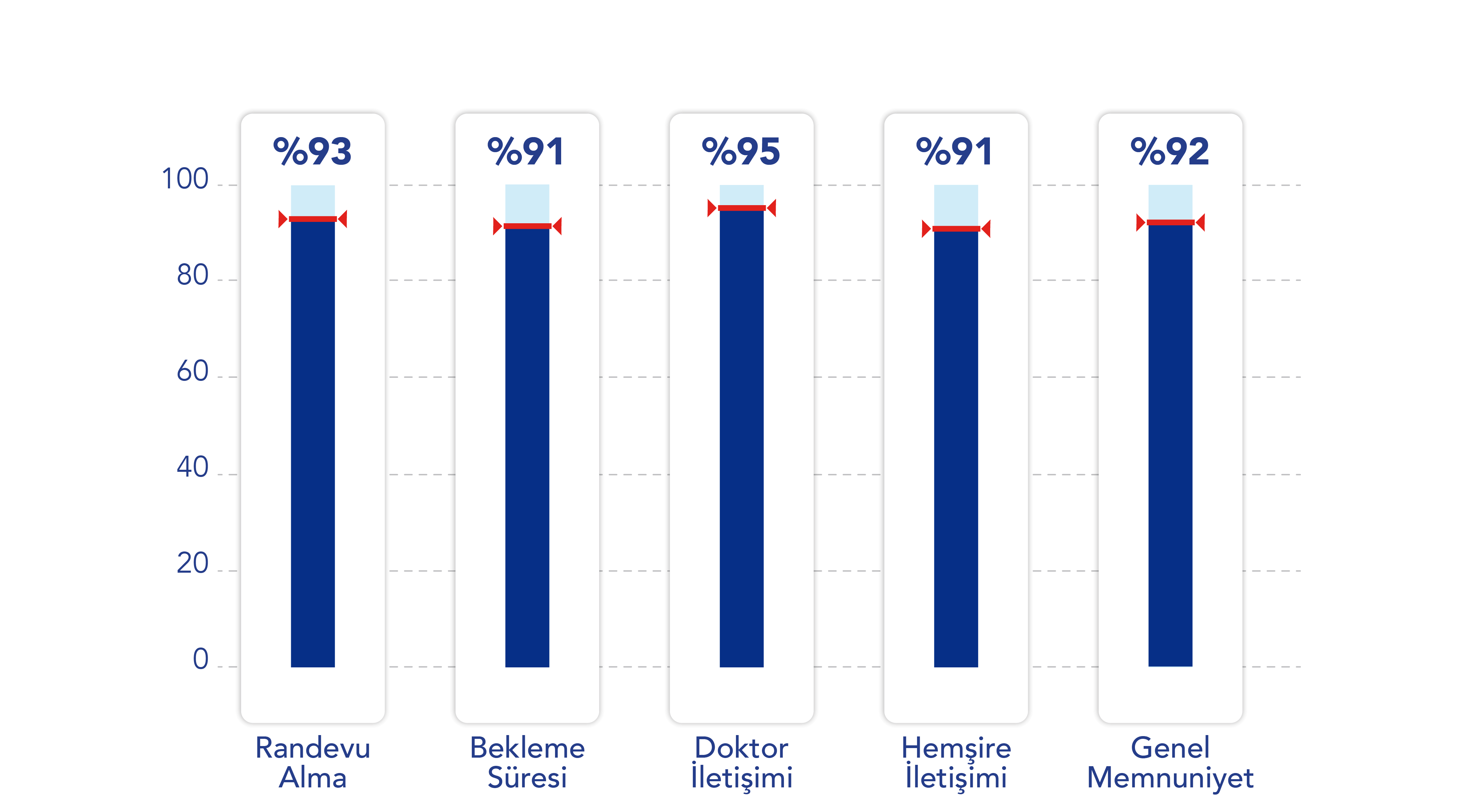 Hasta deneyimi ve hasta memnuniyeti değerlendirilmesi için uygulanan anketlerin objektif ve sayısal verilerle yüzdesel bazda analiz ederek Hasta Deneyim Endeksi oluşturmaktayız. Amacımız sürekli olarak yükseltmek, yüksek hasta memnuniyeti, olumlu hasta deneyimi ve güvenli-kaliteli hizmet sunmaktır.