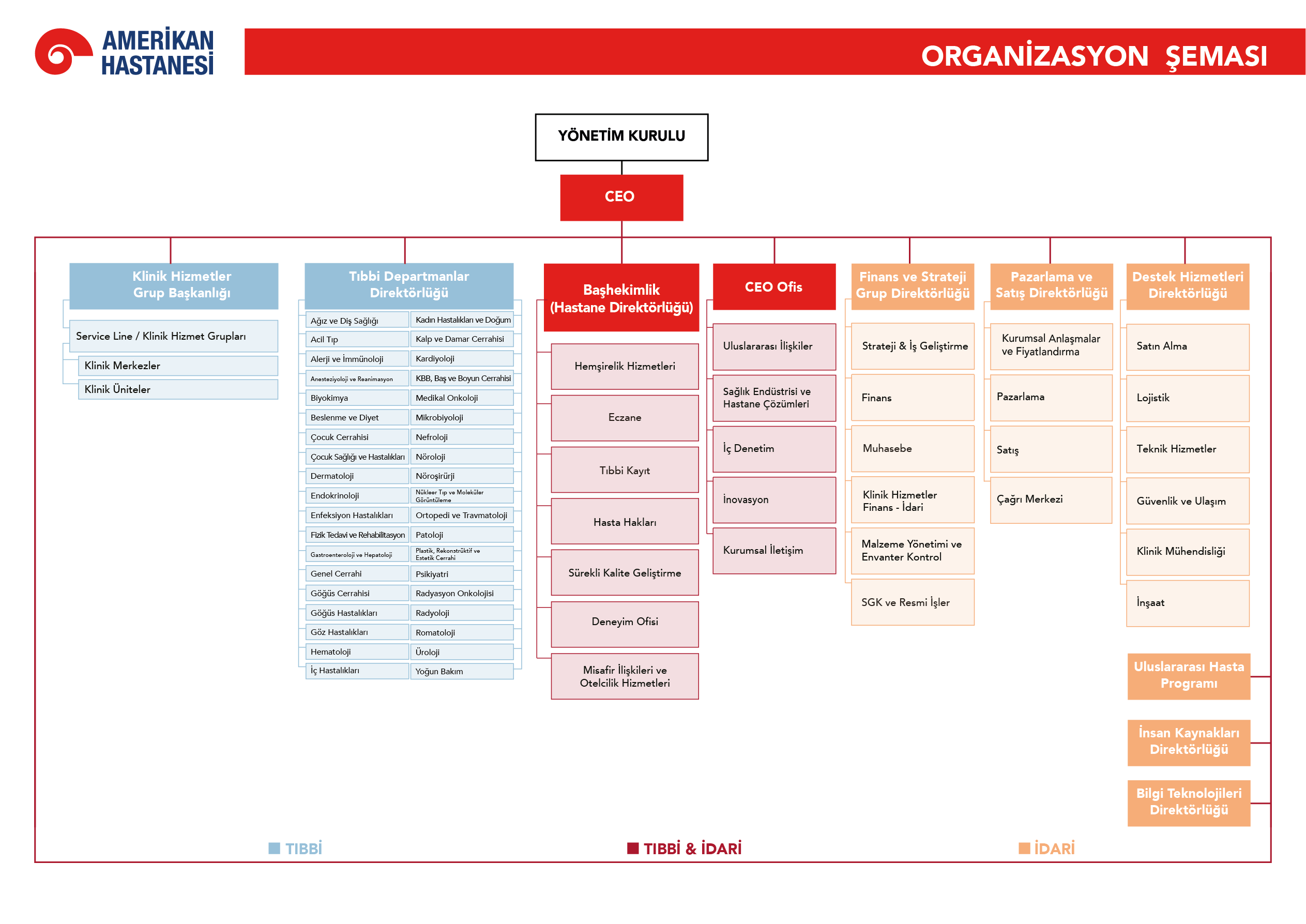 Sağlık kuruluşlarımız, tıbbi ve idari olarak, liderlerin küme sözcüsü olarak değerlendirildiği klasik dikey yapılanma yerine, genel müdürün bir takım bireyi olarak yer aldığı ve koordine ettiği hibrit yapılanma şeklinde organize edilmiştir.